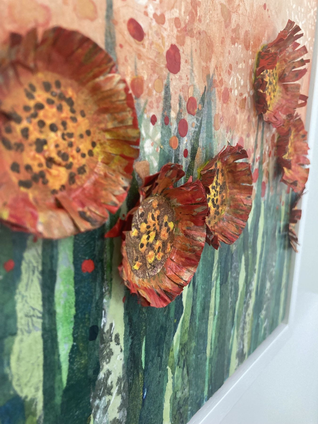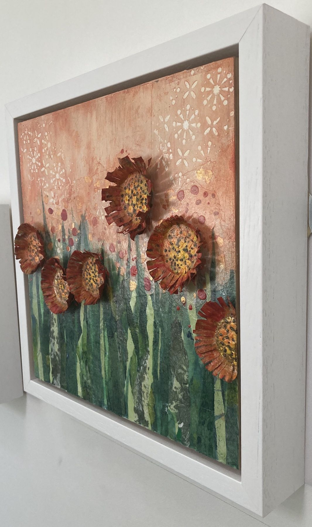 Monsieur's Meadow is 10” x 10” acrylic, collage and repurposed items on deep cradled wood panel.