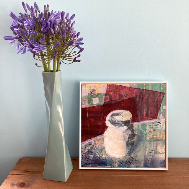 This little pot lives at my parents house and I combined two views of the pot on the table in this painting, introducing some subtle and not-so-subtle elements of cubism.